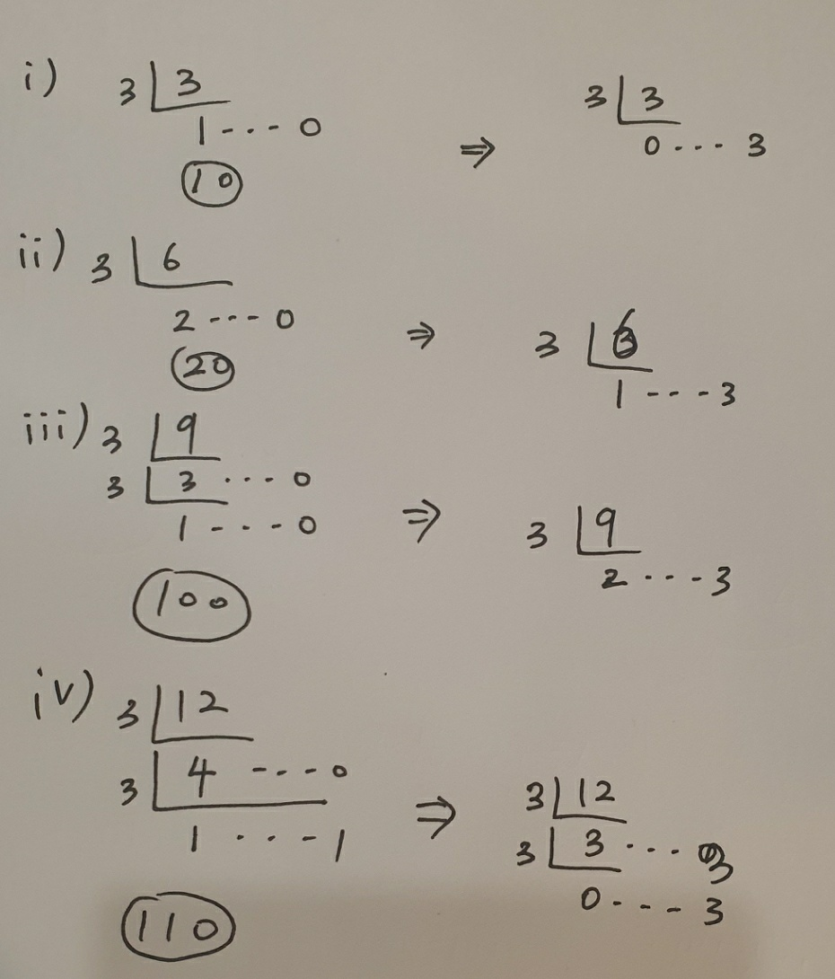 1. ์ฒซ๋ฒ์งธ ์์์์ 3์ง์์ ๊ฒฝ์ฐ 3์ผ๋ก ๋๋์์๋ ๋ชซ์ด 1, ๋๋จธ์ง๊ฐ 0์ด๊ฒ ๋๋ค. ์ด๋ 3์ง์ ์ซ์๋ '10'์ด ๋๋ค. ์ด ๊ฒฝ์ฐ 3์ผ๋ก ๋๋์ด ๋จ์ด์ง๋ฏ๋ก ๋งจ๋ ์ซ์๋ฅผ 0์ผ๋ก ๋ฐ๊พธ๊ณ ์์ผ๋ก 1์ ๋๊ฒจ 3์ ํํํ๊ณ ์๋ค. ํ์ง๋ง ์ฃผ์ด์ง ๋ฌธ์ ์์๋ 0์ด ์๋ '4'๋ก ํํํ๊ณ ์์ผ๋ฉฐ, ์ด๋ ์๋ฆฌ์ฌ๋ฆผ์ด ๋ฐ์ํ๋ฉด ์๋๋ค. ์ด ๋ฐฉ์์ ์ฐฉ์ํ์ฌ ๋ชซ์ ๊ฐ์ง๊ณ ์๋ 1์ ๋๋จธ์ง์ชฝ 3์ผ๋ก ๋๊ฒจ์ค ๋ฐฉ์์ด ์ค๋ฅธ์ชฝ ๋ฐฉ์์ด๋ค. ์ฆ, ๋ชซ์์ 1์ ๊ฐํ๊ณ ๋๋จธ์ง์ 3์ ๋ํด์ค ๋ฐฉ์์ด๋ค. ์ด๋ ๊ฒ ๋์์ ๊ฒฝ์ฐ ๋๋จธ์ง๊ฐ 3์ผ๋๋ '4'๋ก ํํํด์ฃผ๋ฉด ์ข์ธก์ ๊ฒฝ์ฐ 3์ง์ ํํ๋ฒ์ '10'์ด์ง๋ง, ์ฐ์ธก์ ๊ฒฝ์ฐ 124๋๋ผ์ ํํ๋ฐฉ์๋๋ก '4'๋ก ํํํ ์ ์๋ค. ๋ค์ ์์๋ค๋ ํ์ธํด๋ณด์.